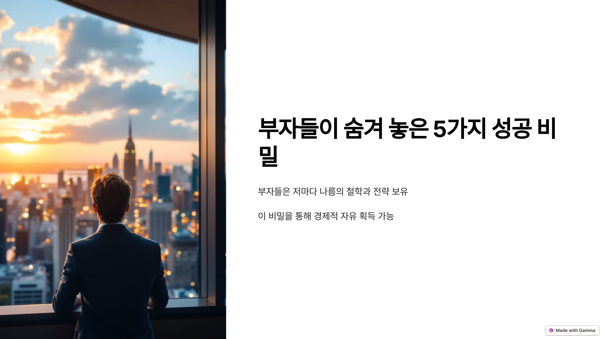부자들은 어떻게 부자가 되었을까요? 성공적인 인생을 살고 있는 사람들은 저마다 나름의 철학과 전략을 가지고 있습니다. 많은 사람들은 이들의 성공 비밀을 궁금해하지만, 실제로 그들이 따르는 몇 가지 중요한 원칙을 알게 되면, 여러분도 부자로 가는 길에 한 걸음 더 가까워질 수 있습니다. 이 글에서는 부자들이 숨겨 놓은 5가지 성공 비밀을 소개하겠습니다. 이 비밀을 통해 여러분도 경제적 자유를 손에 넣을 수 있을 것입니다.